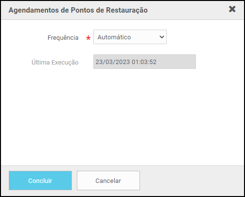 Lembrando que, não é possível criar outro tipo de agendamento (Diário, Semanal, Mensal), caso você esteja usando a frequência Automático. Para a criação das outras opções mencionadas anteriormente, devemos excluir a opção de frequência Automático;Pontos de Restaurações manuais ainda poderão ser realizados mesmo com a frequência Automático configurada.